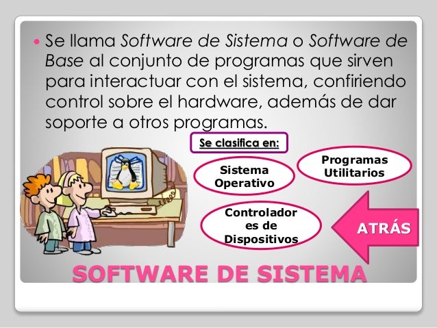 - 5. Se llama Software de Sistema o Software de Base al conjunto de programas que sirven para interactuar con el sistema, confiriendo control sobre el hardware, además de dar soporte a otros programas. Programas Utilitarios ATRÁS Se clasifica en: Sistema Operativo Controlador es de Dispositivos SOFTWARE DE SISTEMA