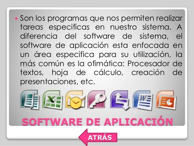 - 6. Son los programas que nos permiten realizar tareas especificas en nuestro sistema. A diferencia del software de sistema, el software de aplicación esta enfocada en un área especifica para su utilización, la más común es la ofimática: Procesador de textos, hoja de cálculo, creación de presentaciones, etc. SOFTWARE DE APLICACIÓN ATRÁS