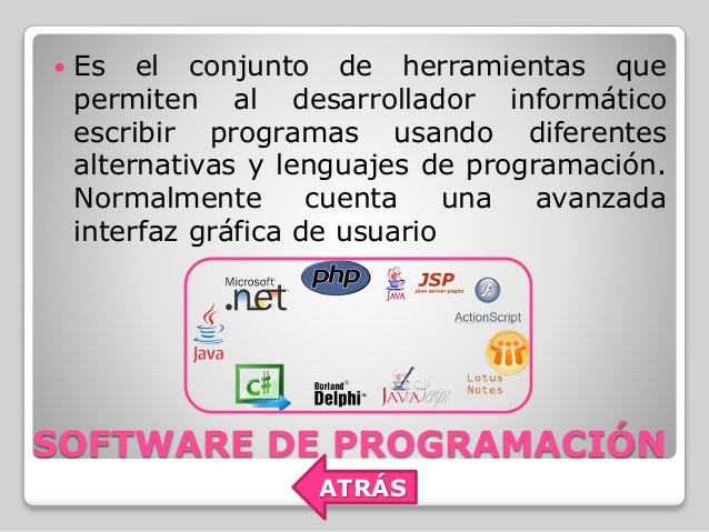 - 7. Es el conjunto de herramientas que permiten al desarrollador informático escribir programas usando diferentes alternativas y lenguajes de programación. Normalmente cuenta una avanzada interfaz gráfica de usuario SOFTWARE DE PROGRAMACIÓN ATRÁS