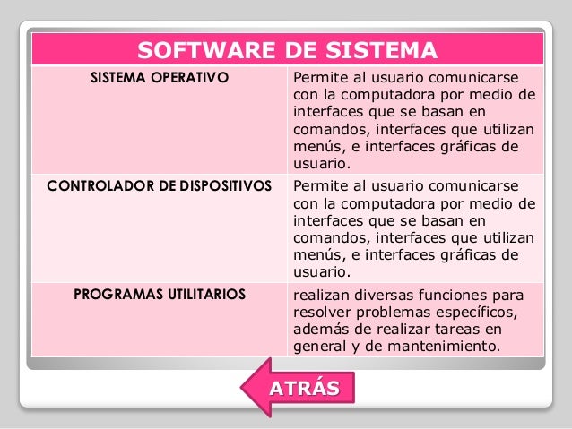 - 8. SOFTWARE DE SISTEMA SISTEMA OPERATIVO Permite al usuario comunicarse con la computadora por medio de interfaces que se basan en comandos, interfaces que utilizan menús, e interfaces gráficas de usuario. CONTROLADOR DE DISPOSITIVOS Permite al usuario comunicarse con la computadora por medio de interfaces que se basan en comandos, interfaces que utilizan menús, e interfaces gráficas de usuario. PROGRAMAS UTILITARIOS realizan diversas funciones para resolver problemas específicos, además de realizar tareas en general y de mantenimiento. ATRÁS